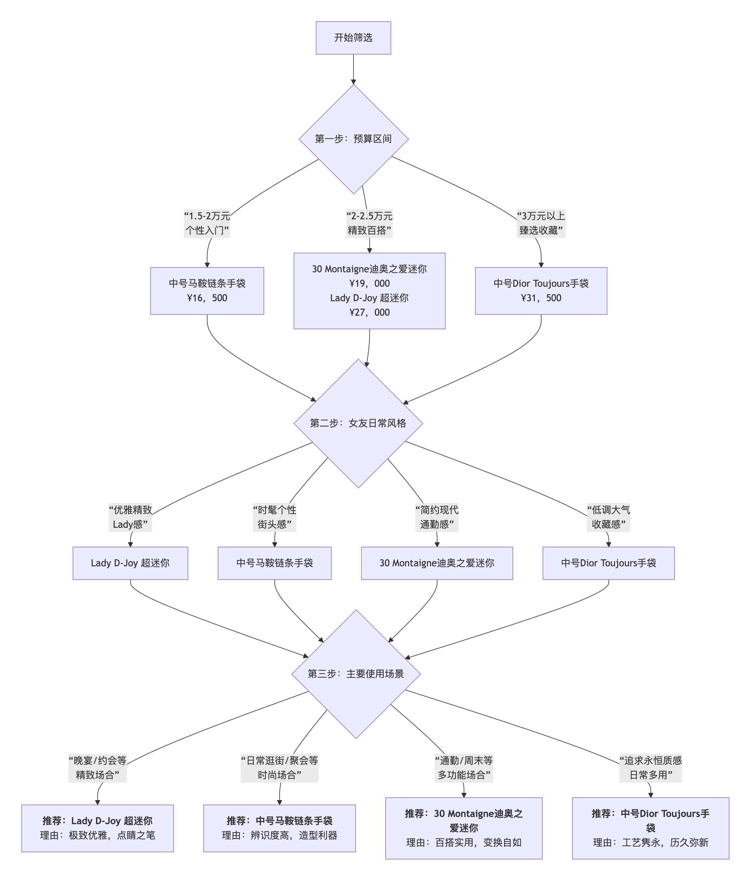 每逢佳节,为特别的人挑选一份既显心意又合心意的礼物,往往是甜蜜的烦恼。今年,当您决定将这份期许寄托于一只DIOR手袋,面对琳琅满目的系列与款式,如何精准决策,避开“好看但不适合”的甜蜜陷阱,成为一项技术活。本文将为您提供一份清晰、高效的三维筛选决策树,从“预算区间”、“风格气质”与“使用场景”三大核心维度出发,手把手带您层层递进,直达最适合她的那一款DIOR。