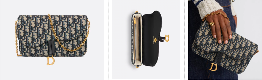 (图注:左:展示马鞍链条手袋正面全貌,蓝白Oblique印花,黑皮镶边,金色“D”字吊饰与链条,造型经典奢华。中:展示马鞍链条手袋内部结构。右:展示中号马鞍链条手袋细节与搭配,Dior经典元素在紧凑构图中彰显精致奢华)