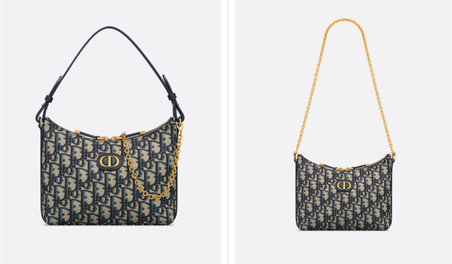(图注:30 Montaigne 迪奥之爱链条手袋正面展示,蓝米Oblique印花,饰以深蓝皮边、金色CD徽标与链条,彰显经典奢华。右:展示手袋搭配的可拆卸链条肩带,可轻松实现手提、肩背或斜挎等多种携带方式,完美适应日常或晚装造型。)