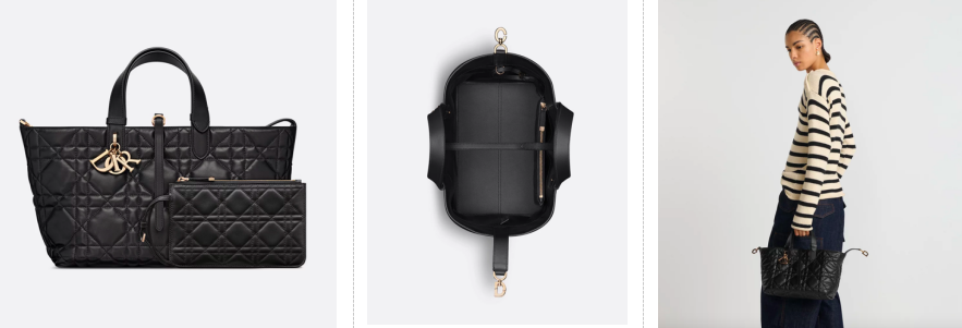 (图注:左:展示手袋正面及可拆卸小袋,饰DIOR金色吊饰,设计经典,质感奢华。中:展示Dior Toujours 手袋开合细节与容量。右:展示手袋搭配效果,造型干练,现代感十足。)
